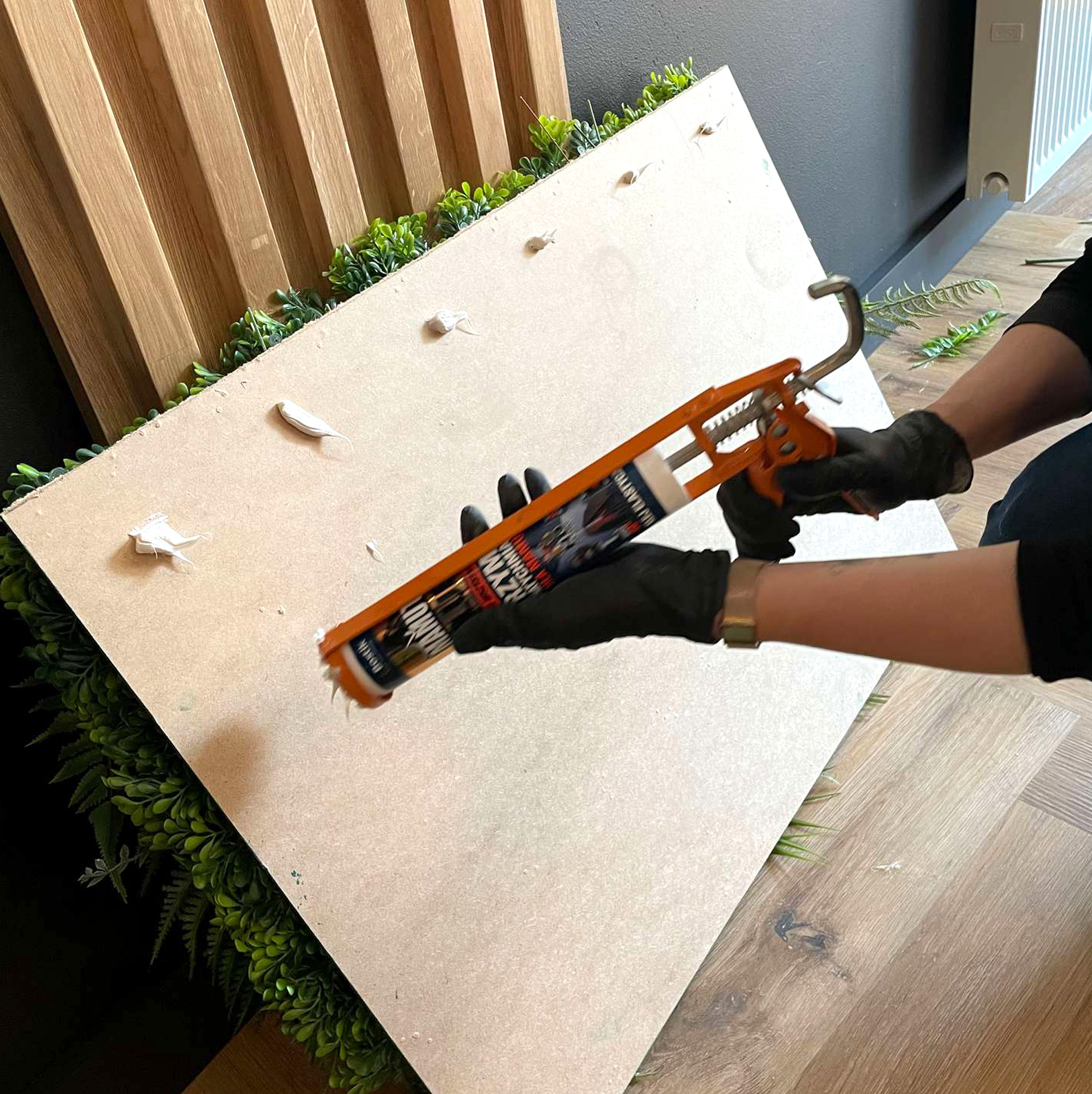 Ścianki zielone i kwiatowe ze sztucznych roślin składają się z wymierzonych paneli, których montaż jest łatwy i intuicyjny. Do każdej ściany dołączamy plan i opis paneli, które po złożeniu tworzą spójną całość. Panele montuje się na klej montażowy (np. Mamut); dobrym rozwiązaniem jest też używanie wkrętów, jeśli stosowanie kleju wydaje się niemożliwym rozwiązaniem.